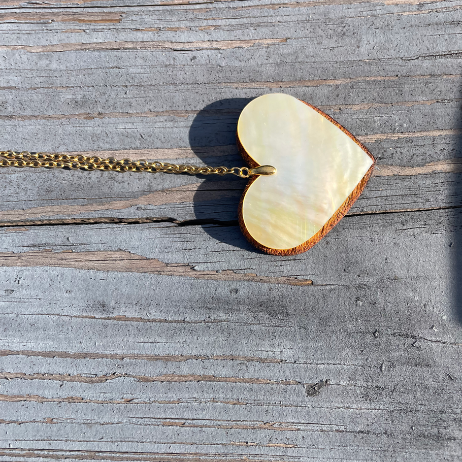 Introducing our timeless piece, "Labor of Love," an exquisite necklace featuring a Golden Mother-of-Pearl Heart pendant. This piece rests gracefully on a rich brown cowhide, perfectly complemented by an 18K Gold Plated Chain. More than just a necklace, "Labor of Love" pays homage to beauty and heartfelt craftsmanship.
